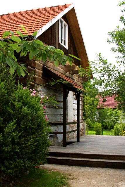 Z boku tarasu jest wejście do niedużej piwniczki. Gdy rozpadła się obórka padający deszcz miał idealne warunki, żeby padać do środka. Było więc jasne, że nad wejściem do piwnicy musi być daszek... Zrobiliśmy konstrukcję najprostszą z możliwych - niewielka połać dachu oparta na dwóch drewnianych słupach, a pomiędzy nimi barierki, żeby było na czym kwiatki wieszać;):) Jako dachówki użyliśmy tej z rozebranej obórki. Ponieważ zamarzyło mi się, że rosnąca tuż obok pnąca róża będzie się pięła po ściance i daszku tarasu, dlatego kłuta niemiłosiernie (kolce!!!) mocowałam linki i nakierowywałam na nie gałązki, niech się pną, a co!:):)